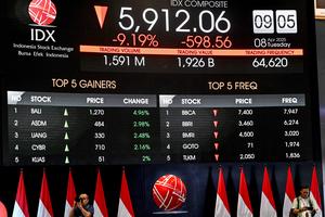 (250408) -- YAKARTA, 8 abril, 2025 (Xinhua) -- Un panel que muestra el Índice Compuesto de Precios de Acciones es visto en el edificio de la Bolsa de Valores de Indonesia, en Yakarta, Indonesia, el 8 de abril de 2025. El mercado de valores de Indonesia interrumpió temporalmente sus operaciones durante 30 minutos el martes por la mañana después de que el índice principal de desplomara un 9,19 por ciento en la apertura, tras un largo feriado por el festival de Eid al-Fitr. (Xinhua/Agung Kuncahya B.) (jg) (ra) (ce)