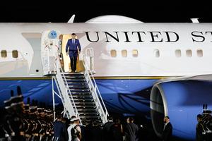 (250408) -- CIUDAD DE PANAMA, 8 abril, 2025 (Xinhua) -- Imagen del 7 de abril de 2025 del secretario de Defensa de Estados Unidos, Pete Hegseth (arriba), llegando al Aeropuerto Internacional Panamá Pacífico, en el distrito de Arraiján, cerca de la Ciudad de Panamá, capital de Panamá. (Xinhua/Daniel González) (jg) (ra) (ce)