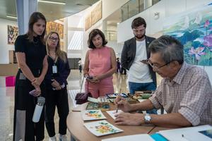 (250410) — GOIANIA, 10 abril, 2025 (Xinhua) — Imagen del 9 de abril de 2025 del público observando a un artista (d) crear una pintura durante un evento cultural chino, en Goiania, estado de Goiás, Brasil. Un evento sobre la cultura tradicional china fue inaugurado el miércoles en la Asamblea Legislativa del Estado de Goiás, atrayendo a numerosos visitantes locales. (Xinhua/Wang Tiancong) (jg) (ah) (ce)