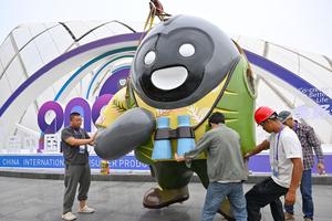 (250410) -- HAIKOU, 10 abril, 2025 (Xinhua) -- Trabajadores colocan una estatua de la mascota para la próxima V Exposición Internacional de Productos de Consumo de China en el Centro Internacional de Convenciones y Exposiciones de Hainan, en Haikou, en la provincia de Hainan, en el sur de China, el 10 de abril de 2025. La V Exposición Internacional de Productos de Consumo de China (CICPE, por sus siglas en inglés), una plataforma clave para el comercio mundial y tendencias de consumo, se llevará a cabo en Haikou, la ciudad capital de la provincia de Hainan, en el sur de China, del 13 al 18 de abril. (Xinhua/Guo Cheng) (rtg) (ra) (vf)
