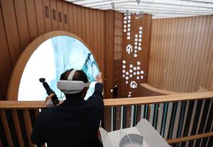 (250413) -- OSAKA, 13 abril, 2025 (Xinhua) -- Un visitante recorre el Pabellón de China mientras utiliza un dispositivo de Realidad Mixta en la Expo de Osaka, en Osaka, Japón, el 13 de abril de 2025. El Pabellón de China se inauguró oficialmente el domingo en la Expo de Osaka, con una ceremonia de inauguración celebrada frente al edificio principal del pabellón, que está diseñado para parecerse a un pergamino chino tradicional. Inspirado en los pergaminos de caligrafía tradicional china, el diseño arquitectónico del pabellón encarna el tema "Construir una comunidad de vida para el hombre y la naturaleza: la futura sociedad del desarrollo verde". La Expo 2025 de Osaka se celebrará del 13 de abril al 13 de octubre de 2025. El Pabellón de China, uno de los mayores pabellones extranjeros autoconstruidos del evento, ocupa aproximadamente 3.500 metros cuadrados. (Xinhua/Jia Haocheng) (oa) (ah)