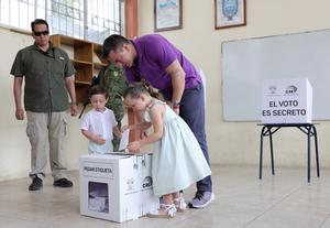 (250413) -- OLON, 13 abril, 2025 (Xinhua) -- Imagen cedida por la Presidencia de Ecuador del presidente ecuatoriano y candidato a la reelección, Daniel Noboa, emitiendo su voto acompañado de sus hijos en un colegio electoral, en Olón, en la provincia de Santa Elena, Ecuador, el 13 de abril de 2025. Noboa ejerció el domingo el voto en la segunda vuelta de las elecciones presidenciales, confiado en una eventual victoria ante su rival de izquierda, Luisa González. (Xinhua/Isaac Castillo/Presidencia del Ecuador) (oa) (ah)