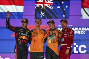 (250421) -- JEDDAH, 21 abril, 2025 (Xinhua) -- Imagen del 20 de abril de 2025 del ganador del segundo lugar, el piloto neerlandés de la escudería Red Bull, Max Verstappen (i), el ganador del primer lugar, el piloto australiano de la escudería McLaren, Oscar Piastri (2-d), y el ganador del tercer lugar, el piloto monegasco de la escudería Ferrari, Charles Leclerc (d), posando en la ceremonia de premiación al término de la carrera del Gran Premio de Arabia Saudita de Fórmula Uno, en el Circuito Jeddah Corniche, en Jeddah, Arabia Saudita. (Xinhua/Qian Jun) (rtg) (ah) (vf)