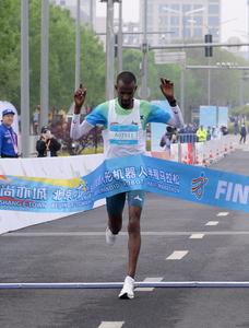 (250419) -- BEIJING, 19 abril, 2025 (Xinhua) -- Elias Desta, de Etiopía, cruza la línea de meta durante la media maratón de Beijing E-Town y la media maratón de robots humanoides en el Area de Desarrollo Económico y Tecnológico de Beijing, en el sureste de Beijing, China, el 19 de abril de 2025. (Xinhua/Li He) (oa) (da)