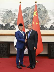 (250421) -- BEIJING, 21 abril, 2025 (Xinhua) -- El miembro del Buró Político del Comité Central del Partido Comunista de China y ministro de Relaciones Exteriores, Wang Yi, sostiene conversaciones con el ministro indonesio de Relaciones Exteriores, Sugiono, en Beijing, capital de China, el 21 de abril de 2025. (Xinhua/Zhang Ling) (rtg) (ah) (ce)