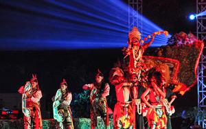 (250420) -- PASURUAN, 20 abril, 2025 (Xinhua) -- Imagen del 19 de abril de 2025 de artistas realizando una presentación durante un evento de interpretación artística para recibir al Día de la Tierra, en Pasuruan, Java Oriental, Indonesia. (Xinhua/Sahlan Kurniawan) (rtg) (ah)