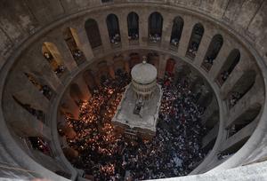 (250420) -- JERUSALEN, 20 abril, 2025 (Xinhua) -- Imagen del 19 de abril de 2025 de feligreses reunidos durante la ceremonia del Fuego Sagrado en la Iglesia del Santo Sepulcro, en la Ciudad Vieja de Jerusalén. (Xinhua/Jamal Awad) (oa) (da)