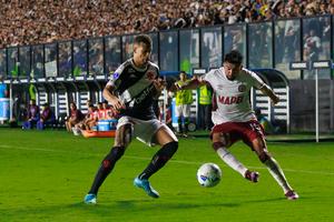 (250423) -- RIO DE JANEIRO, 23 abril, 2025 (Xinhua) -- Imagen del 22 de abril de 2025 del jugador João Victor (i), de Vasco da Gama de Brasil, disputando el balón con Marcelino Moreno (d), de Lanús de Argentina durante el partido del grupo G de la jornada 3 de la Fase de Grupos de la Copa Conmebol Sudamericana, celebrado en el Estadio Sao Januário, en Río de Janeiro, Brasil. (Xinhua/Claudia Martini) (cm) (ah) (ra) (vf)