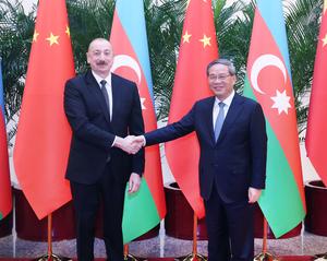 (250423) -- BEIJING, 23 abril, 2025 (Xinhua) -- El primer ministro chino, Li Qiang, se reúne con el presidente de Azerbaiyán, Ilham Aliyev, quien está realizando una visita de Estado a China, en el Gran Palacio del Pueblo, en Beijing, capital de China, el 23 de abril de 2025. (Xinhua/Liu Weibing) (jg) (da) (ce)