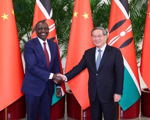 (250423) -- BEIJING, 23 abril, 2025 (Xinhua) -- El primer ministro chino, Li Qiang, se reúne con el presidente de Kenia, William Ruto, quien está realizando una visita de Estado a China, en el Gran Palacio del Pueblo, en Beijing, capital de China, el 23 de abril de 2025. (Xinhua/Liu Bin) (jg) (da) (ce)