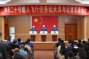 (250423) -- JIUQUAN, 23 abril, 2025 (Xinhua) -- Los astronautas para la misión de vuelo espacial Shenzhou-20, Chen Dong (c), Chen Zhongrui (d), y Wang Jie, se reúnen con la prensa en el Centro de Lanzamiento de Satélites de Jiuquan, en el noroeste de China, el 23 de abril de 2025. (Xinhua/Li Xin) (ah) (ra) (vf)