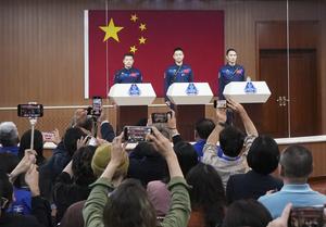 (250423) -- JIUQUAN, 23 abril, 2025 (Xinhua) -- Los astronautas para la misión de vuelo espacial Shenzhou-20, Chen Dong (c), Chen Zhongrui (d), y Wang Jie, se reúnen con la prensa en el Centro de Lanzamiento de Satélites de Jiuquan, en el noroeste de China, el 23 de abril de 2025. (Xinhua/Han Qiyang) (ah) (ra) (vf)
