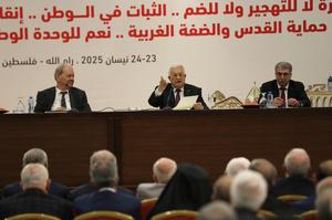 (250423) -- RAMALA, 23 abril, 2025 (Xinhua) -- El presidente palestino, Mahmoud Abbas (c), habla en una reunión del Consejo Central de la Organización para la Liberación de Palestina (OLP), en la ciudad cisjordana de Ramala, el 23 de abril de 2025. Abbas pidió el miércoles llevar a cabo una conferencia internacional de paz bajo los auspicios de la Organización de las Naciones Unidas, Estados Unidos, Rusia, China, la Unión Europea, Japón, Sudáfrica y Brasil, destinada a lograr una paz justa, amplia y duradera en la región. (Xinhua/Ayman Nobani) (jg) (da) (vf)