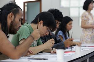 (250423) -- LIMA, 23 abril, 2025 (Xinhua) -- Imagen del 22 de abril de 2025 de alumnos realizando trazos en un taller de caligrafía china impartido por el Instituto Confucio de la Pontificia Universidad Católica del Perú (PUCP) en el marco de la celebración del Día Internacional de la Lengua China, en la Pontificia Universidad Católica, en Lima, Perú. Aprender el idioma chino es considerado por los estudiantes del Instituto Confucio de la PUCP como una oportunidad para acercarse a la cultura china, afirmó el miércoles la directora de la institución en el país sudamericano, Maribel Temoche. (Xinhua/Mariana Bazo) (mb) (jg) (da) (ce)