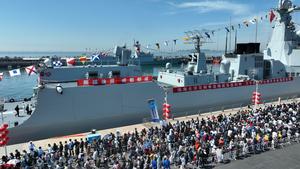 (250423) -- BEIJING, 23 abril, 2025 (Xinhua) -- Vista aérea tomada con un dron el 22 de abril de 2025 de personas participando en la jornada de puertas abiertas de un buque de guerra para conmemorar el 76 aniversario de la Armada del Ejército Popular de Liberación (EPL) de China, en Qingdao, en la provincia de Shandong, en el este de China. La Armada del EPL de China celebró el miércoles su 76 aniversario, reafirmando su compromiso de convertirse en una fuerza naval de clase mundial dedicada a salvaguardar tanto la seguridad nacional como la paz global. (Xinhua/Ma Yubin) (jg) (da) (ce)