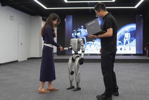 (250423) -- HANGZHOU, 23 abril, 2025 (Xinhua) -- Un robot humanoide Unitree G1 muestra una acción de apretón de manos en una sala de exposiciones de Unitree Robotics, en Hangzhou, en la provincia de Zhejiang, en el este de China, el 23 de abril de 2025. El robot humanoide Unitree G1 demostró una serie de acciones recientemente actualizadas el miércoles en Hangzhou. (Xinhua/Huang Zongzhi) (jg) (da)