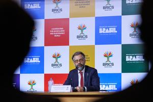(250426) -- RIO DE JANEIRO, 26 abril, 2025 (Xinhua) -- El embajador brasileño Mauricio Carvalho Lyrio, secretario de Asuntos Económicos y Financieros del Ministerio de Relaciones Exteriores y jefe negociador (sherpa) en el grupo BRICS, asiste a una conferencia de prensa sobre la próxima Reunión de Ministros de Relaciones Exteriores del BRICS en el Centro Cultural Light, en Río de Janeiro, Brasil, el 26 de abril de 2025. (Xinhua/Claudia Martini) (cm) (oa) (da)