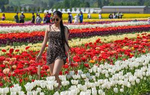 (250426) -- ABBOTSFORD, 26 abril, 2025 (Xinhua) -- Imagen del 25 de abril de 2025 de una mujer caminando entre hileras de tulipanes, en Abbotsford, Columbia Británica, Canadá. Un festival del tulipán, con más de 100 variedades de tulipanes, se celebra en Abbotsford hasta el 11 de mayo. (Xinhua/Liang Sen) (jg) (da)