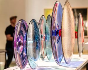 (250425) -- TORONTO, 25 abril, 2025 (Xinhua) -- Imagen del 24 de abril de 2025 de un hombre caminando frente a obras de arte en vidrio exhibidas en la Galería Sandra Ainsley, en Toronto, Canadá. Como una de las principales galerías contemporáneas de vidrio de Norteamérica, la Galería Sandra Ainsley exhibe obras de arte en vidrio de más de 60 artistas de todo el mundo. (Xinhua/Zou Zheng) (oa) (ra) (ce)