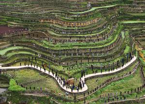 (250426) -- CONGJIANG, 26 abril, 2025 (Xinhua) -- Vista aérea tomada con un dron de aldeanos participando en un evento cultural en campos aterrazados, en el distrito de Congjiang, en la provincia de Guizhou, en el suroeste de China, el 26 de abril de 2025. Una variedad de eventos culturales se llevaron a cabo aquí para mostrar la agricultura tradicional y los coloridos trajes étnicos locales. (Xinhua/Yang Wenbin) (oa) (da)
