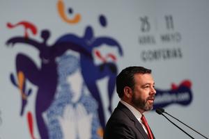 (250426) -- BOGOTA, 26 abril, 2025 (Xinhua) -- Imagen del 25 de abril de 2025 del alcalde de Bogotá, Carlos Fernando Galán, hablando durante la inauguración de la 37ª Feria Internacional del Libro de Bogotá (FILBo) en el recinto ferial Corferias, en la ciudad de Bogotá, capital de Colombia. La 37ª FILBo se inauguró el viernes por la noche en el recinto ferial Corferias de la capital colombiana, con España como país invitado de honor. (Xinhua/Andrés Moreno) (am) (oa) (da)