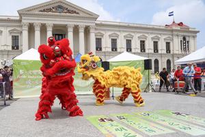 (250426) — SAN SALVADOR, 26 abril, 2025 (Xinhua) — Imagen del 25 de abril de 2025 de artistas realizando la danza del dragón durante la celebración del Día Internacional del Idioma Chino en la Plaza Gerardo Barrios, en la ciudad de San Salvador, capital de El Salvador. Estudiantes del Instituto Confucio de la Universidad de El Salvador y personas interesadas en la civilización china celebraron el viernes el Día Internacional del Idioma Chino con una serie de actividades llenas de encanto y tradición. (Xinhua/Alexander Peña) (ap) (rtg) (da)