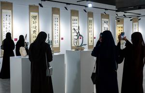 (250425) -- DOHA, 25 abril, 2025 (Xinhua) -- Imagen del 24 de abril de 2025 de personas visitando la exposición de caligrafía "Diálogo de Letras Entre Qatar y China", en la Aldea Cultural Katara, en Doha, Qatar. La exposición se inauguró aquí el miércoles, con el objetivo de promover los intercambios culturales y de arte entre ambos países. (Xinhua/Nikku) (rtg) (ra) (ce)
