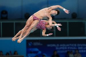 (250502) — BEIJING, 2 mayo, 2025 (Xinhua) — Randal Willars Valdez (frente)/Alejandra Estudillo Torres, de México, compiten durante la final de equipos mixtos 3m y 10m en la Súper Final de la Copa del Mundo de Clavados 2025 de World Aquatics, en Beijing, capital de China, el 2 de mayo de 2025. (Xinhua/Ju Huanzong) (rtg) (ra) (vf)