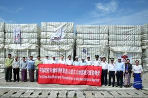 (250503) -- YANGON, 3 mayo, 2025 (Xinhua) -- Participantes posan para una fotografía grupal durante la ceremonia de entrega del undécimo lote de suministros de ayuda humanitaria de emergencia enviado por el Gobierno chino, en Yangón, Myanmar, el 3 de mayo de 2025. El undécimo lote de suministros de ayuda humanitaria de emergencia enviado por el Gobierno chino fue entregado a Myanmar el sábado, en Yangón, Myanmar. (Xinhua/Myo Kyaw Soe) (jg) (da)