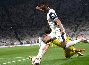 (250502) -- LONDRES, 2 mayo, 2025 (Xinhua) -- Imagen del 1 de mayo de 2025 de Destiny Udogie (frente), de Tottenham Hotspur, disputando el balón durante el partido de semifinales de ida de la Europa League de la UEFA entre Tottenham Hotspur y Bodo/Glimt, en Londres, Reino Unido. (Xinhua/Li Ying) (rtg) (ra) (vf)