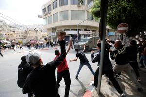 (250505) -- NAPLUSA, 5 mayo, 2025 (Xinhua) -- Imagen del 4 de mayo de 2025 de un manifestante palestino visto durante enfrentamientos entre palestinos y fuerzas israelíes, en la antigua ciudad de Naplusa, en el norte de Cisjordania. (Xinhua/Nidal Eshtayeh) (oa) (ah) (ce)