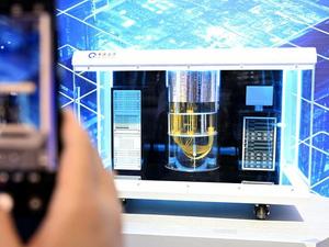 (240920) -- HEFEI, Sept. 20, 2024 (Xinhua) -- A visitor takes photos of an Origin Wukong superconducting quantum computer model at the 2024 World Manufacturing Convention in Hefei, east China's Anhui Province, Sept. 20, 2024. The 2024 World Manufacturing Convention opened Friday in Hefei, capital of east China's Anhui Province, highlighting the latest products and innovations in the manufacturing sector.