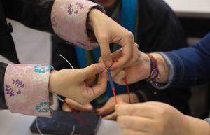 (250506) -- LIMA, 6 mayo, 2025 (Xinhua) -- Imagen del 5 de mayo de 2025 de una profesora enseñando a una alumna a hacer nudos en el taller "El arte de los nudos chinos" organizado por el Instituto Confucio de la Pontificia Universidad Católica del Perú (PUCP), en Lima, Perú. Peruanos participaron el lunes en el taller "El arte de los nudos chinos", organizado por el Instituto Confucio de la PUCP, para impulsar un mayor acercamiento de los ciudadanos de este país andino a la cultura china. (Xinhua/Mariana Bazo) (mb) (jg) (ra) (ce)