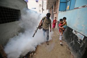 (250507) -- DHAKA, 7 mayo, 2025 (Xinhua) -- Imagen del 6 de mayo de 2025 de un trabajador rociando materiales antimosquitos para prevenir la propagación del dengue, en Dhaka, Bangladesh. (Xinhua/Habibur Rahman) (ah) (ra) (ce)