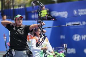 (250510) -- SHANGHAI, 10 mayo, 2025 (Xinhua) -- Andrea Becerra, del equipo de México, compite durante la final por la medalla de oro de la competencia de compuesto femenino por equipos en la etapa 2 de la Copa del Mundo de Tiro con Arco de Shanghai 2025, en Shanghai, China, el 10 de mayo de 2025. (Xinhua/Wang Xiang) (rtg) (da)