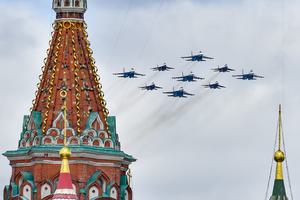 (250509) -- MOSCU, 9 mayo, 2025 (Xinhua) -- Aeronaves vuelan en formación durante un gran desfile para conmemorar el 80° aniversario de la victoria en la Gran Guerra Patriótica de la Unión Soviética, en Moscú, Rusia, el 9 de mayo de 2025. (Xinhua/Alexander Zemlianichenko Jr) (rtg) (ra) (vf)