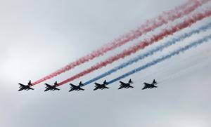 (250509) -- MOSCU, 9 mayo, 2025 (Xinhua) -- Aeronaves vuelan en formación durante un gran desfile para conmemorar el 80° aniversario de la victoria en la Gran Guerra Patriótica de la Unión Soviética, en Moscú, Rusia, el 9 de mayo de 2025. (Xinhua/Wang Ye) (rtg) (ra) (vf)