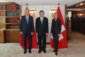 (250510) -- GINEBRA, 10 mayo, 2025 (Xinhua) -- Karin Keller-Sutter, presidenta de la Confederación Suiza, y Guy Parmelin, vicepresidente del Consejo Federal Suizo, se reúnen con el vice primer ministro chino, He Lifeng, en Ginebra, Suiza, el 9 de mayo de 2025. (Xinhua/Zhao Dingzhe) (jg) (da)