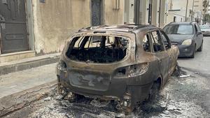 (250514) -- TRIPOLI, 14 mayo, 2025 (Xinhua) -- Imagen del 14 de mayo de 2025 de un automóvil dañado durante enfrentamientos violentos en una calle, en Trípoli, Libia. El Gobierno de Unidad Nacional de Libia, con sede en Trípoli, declaró el miércoles un cese al fuego tras los intensos enfrentamientos nocturnos entre milicias rivales que se extendieron a distritos centrales y residenciales de la capital, lo que provocó llamamientos internacionales para proteger a los civiles y evitar una mayor escalada. (Xinhua/Hamza Turkia) (jg) (da) (vf)