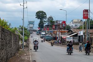 (250514) -- GOMA, 14 mayo, 2025 (Xinhua) -- Imagen del 5 de mayo de 2025 de una calle del centro (frente) y una torre de control de tránsito aéreo (atrás), en Goma, en la República Democrática del Congo (RDC). Antaño un bullicioso centro fronterizo enclavado bajo la imponente silueta del monte Nyiragongo, la ciudad de Goma, en el este de la RDC, se encuentra sumida en una tensa e inestable calma. (Xinhua/Zheng Yangzi) (jg) (da) (vf)