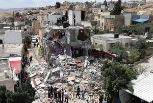 (250515) -- TAMMUN, 15 mayo, 2025 (Xinhua) -- Palestinos inspeccionan los escombros de un edificio demolido tras una operación israelí, en el poblado cisjordano de Tammun, el 15 de mayo de 2025. Las fuerzas israelíes mataron a cinco palestinos durante una incursión en Tammun el jueves, dijo el Ejército, describiendo a los muertos como militantes involucrados en lo que llamó "actividad terrorista significativa". (Xinhua/Ayman Nobani) (jg) (ah) (ce)
