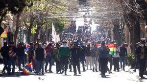 (250516) -- LA PAZ, 16 mayo, 2025 (Xinhua) -- Indígenas se preparan para ingresar a las instalaciones del Tribunal Supremo Electoral durante una marcha en apoyo al expresidente boliviano Evo Morales en la ciudad de La Paz, Bolivia, el 16 de mayo de 2025. La multitudinaria marcha de sectores afines al expresidente boliviano Evo Morales concluyó el viernes con violentos enfrentamientos entre la Policía y los manifestantes en inmediaciones del Tribunal Supremo Electoral en La Paz, en medio de una tensa jornada marcada por gases lacrimógenos, piedras, detenidos, heridos y denuncias de agresiones a periodistas. (Xinhua/Javier Mamani) (jm) (rtg) (ra) (vf)