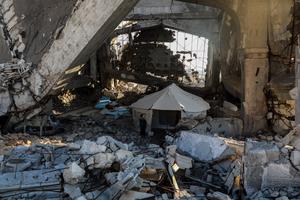 (250521) -- GAZA, 21 mayo, 2025 (Xinhua) -- Un niño desplazado permanece junto a una tienda de campaña entre los escombros de un edificio destruido en la zona del puerto marítimo del oeste de la Ciudad de Gaza, el 21 de mayo de 2025. El presidente palestino, Mahmoud Abbas, pidió el miércoles a la comunidad internacional que tome medidas inmediatas en respuesta a la situación "catastrófica y trágica" en la Franja de Gaza. (Xinhua/Rizek Abdeljawad) (ra) (vf)