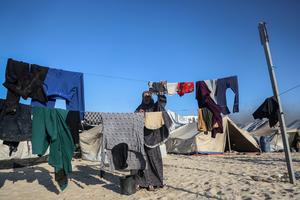 (250521) -- GAZA, 21 mayo, 2025 (Xinhua) -- Una mujer desplazada seca ropa al aire en un refugio temporal en la zona del puerto marítimo del oeste de la Ciudad de Gaza, el 21 de mayo de 2025. El presidente palestino, Mahmoud Abbas, pidió el miércoles a la comunidad internacional que tome medidas inmediatas en respuesta a la situación "catastrófica y trágica" en la Franja de Gaza. (Xinhua/Rizek Abdeljawad) (ra) (vf)
