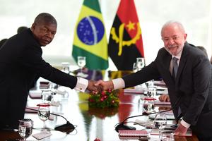 (250523) -- BRASILIA, 23 mayo, 2025 (Xinhua) -- El presidente de Brasil, Luiz Inácio Lula da Silva (d), estrecha la mano del presidente de Angola, Joao Lourenco (i), durante una reunión bilateral, en el Palacio de Planalto, en Brasilia, Brasil, el 23 de mayo de 2025. (Xinhua/Lucio Tavora) (lt) (jg) (da) (vf)