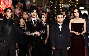 (250523) -- CANNES, 23 mayo, 2025 (Xinhua) -- Imagen del 22 de mayo de 2025 del director, Bi Gan (2-d-frente), Shu Qi (d-frente), Yi Yangqianxi (2-i-frente), y Mark Zhao (i-frente), llegando a la alfombra roja previo al estreno de la película "Resurrection" durante la 78 edición del Festival de Cine de Cannes, en Cannes, en el sur de Francia. La 78 edición del Festival de Cine de Cannes comenzó en Cannes el 13 de mayo, con la película china "Resurrection" dirigida por Bi Gan compitiendo para el honor más alto del festival, la Palma de Oro, junto a otras 21 películas. (Xinhua/Gao Jing) (rtg) (ra) (ce)