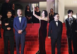(250523) -- CANNES, 23 mayo, 2025 (Xinhua) -- Imagen del 22 de mayo de 2025 del director, Bi Gan (2-d), Shu Qi (c), Yi Yangqianxi (d), Huang Jue (2-i), y Mark Zhao (i), llegando a la alfombra roja previo al estreno de la película "Resurrection" durante la 78 edición del Festival de Cine de Cannes, en Cannes, en el sur de Francia. La 78 edición del Festival de Cine de Cannes comenzó en Cannes el 13 de mayo, con la película china "Resurrection" dirigida por Bi Gan compitiendo para el honor más alto del festival, la Palma de Oro, junto a otras 21 películas. (Xinhua/Gao Jing) (rtg) (ra) (ce)