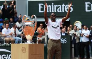 (250603) -- PARÍS, 3 junio, 2025 (Xinhua) -- Imagen del 2 de junio de 2025 del delantero francés, Ousmane Dembele, de Paris Saint-Germain, saludando a los espectadores mientras presenta el trofeo de la Liga de Campeones de la UEFA en la cancha Philippe Chatrier en el torneo de tenis Abierto de Francia, en Roland Garros, en París, Francia. (Xinhua/Gao Jing) (jg) (ra) (vf)
