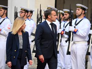 (250603) -- ROMA, 3 junio, 2025 (Xinhua) -- La primera ministra italiana, Giorgia Meloni (i-frente), y el presidente francés, Emmanuel Macron (d-frente), inspeccionan una guardia de honor en el Palacio Chigi, en Roma, Italia, el 3 de junio de 2025. Meloni recibió el martes a Macron y ambos líderes sostuvieron conversaciones bilaterales sobre diversos temas, entre ellos el comercio, y las relaciones con Estados Unidos, según medios italianos. (Xinhua/Alberto Lingria) (oa) (ra) (vf)