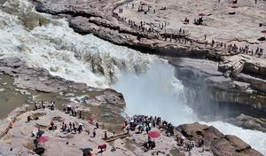 (250604) -- YICHUAN, 4 junio, 2025 (Xinhua) -- Vista aérea tomada con un dron el 4 de junio de 2025 de turistas visitando la cascada Hukou en el río Amarillo, en la frontera entre las provincias de Shanxi, en el norte de China, y Shaanxi, en el noroeste de China. (Xinhua/Zhang Bowen) (ra) (vf)